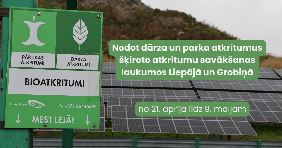 Tuvojoties “Lielajai talkai” un pavasara teritoriju sakopšanas sezonai, Dienvidkurzemes atkritumu apsaimniekošanas reģionālais centrs SIA “Liepājas RAS” atgādina, ka poligonā “Ķīvītes” dārza un parka atkritumus bez maksas var nodot pastāvīgi. Savukārt sadarbībā ar SIA “Eco Baltia vide” un PS “Vides pakalpojumu grupa” no 21. aprīļa līdz 9. maijam tos bez maksas būs iespējams nodot arī šķiroto atkritumu savākšanas laukumos Liepājā.